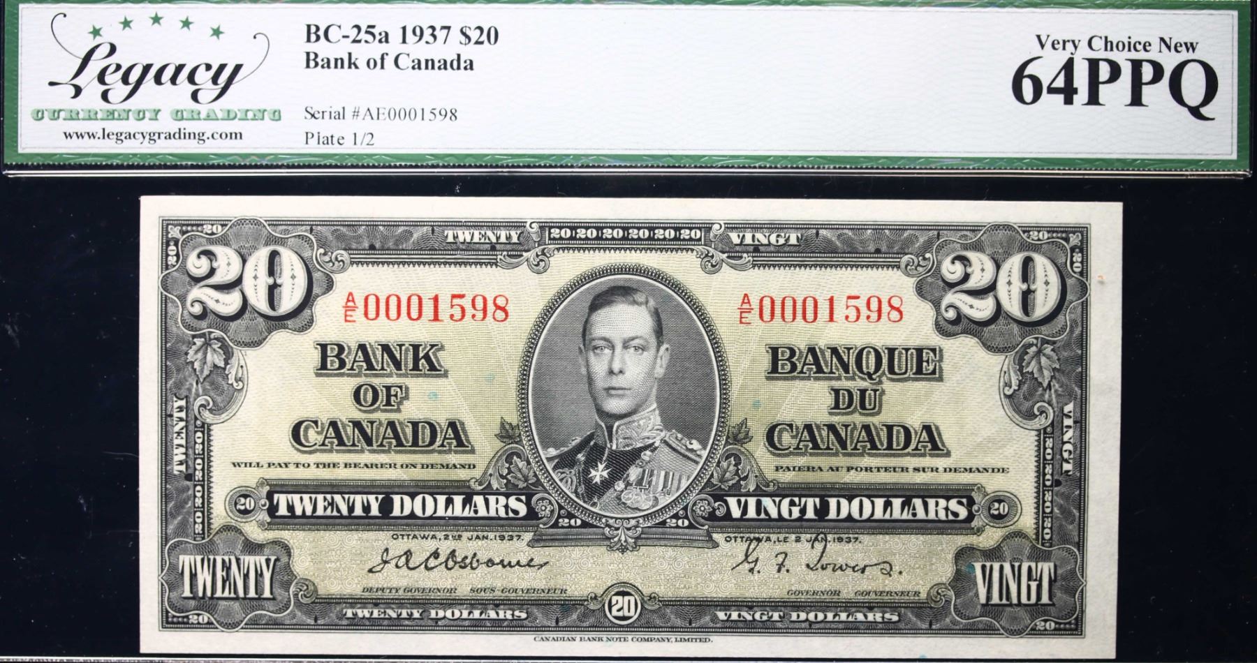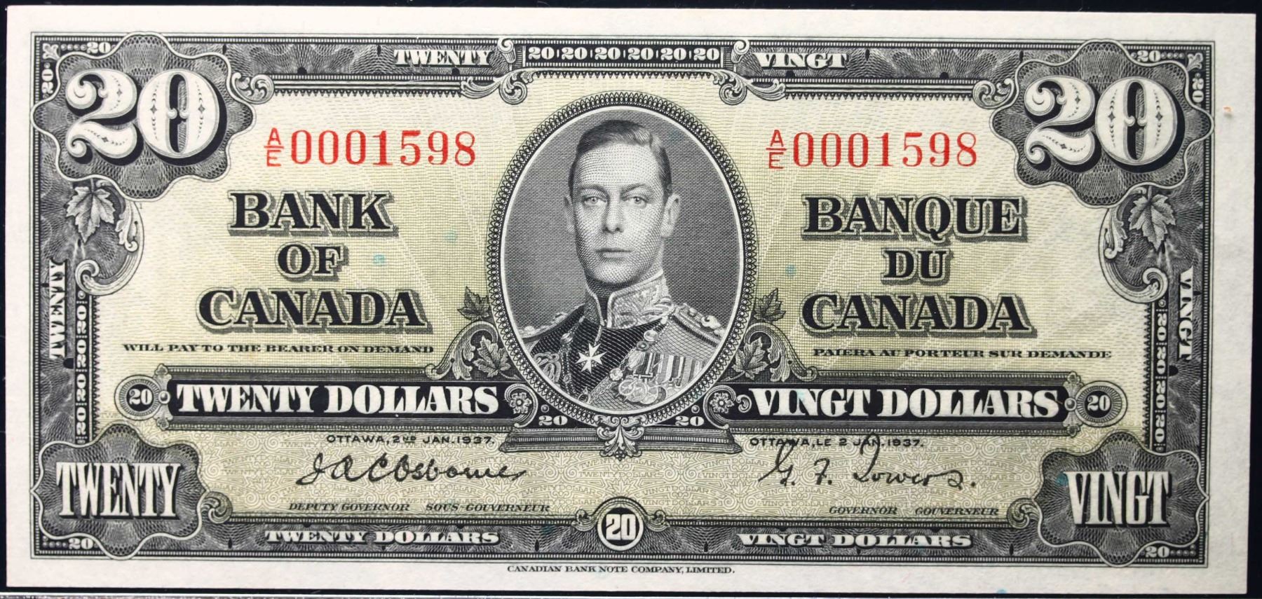1937 $20 BC-25a #A/E0001598 LCG Choice Uncirculated-64PPQ. Scarce "Osborne-Towers" signatures in Near Gem condition.