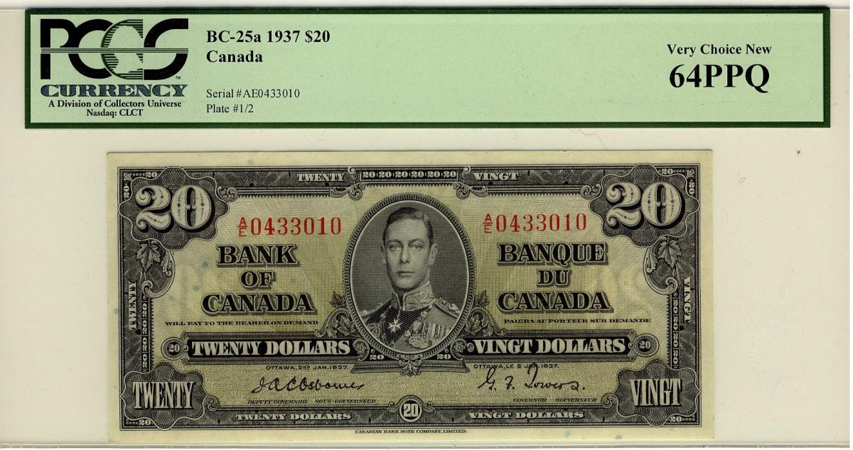 1937 $20 BC-25a A/E0433010 PCGS UNC64PPQ. Vibrant colours with great embossing.