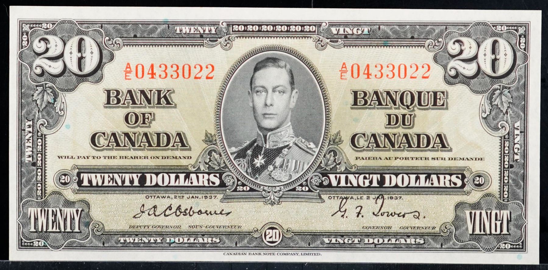 1937 $20 BC-25a #A/E0433022 Unc or better. This is a pristine issue with great eye appeal, good margins and superb embossing.