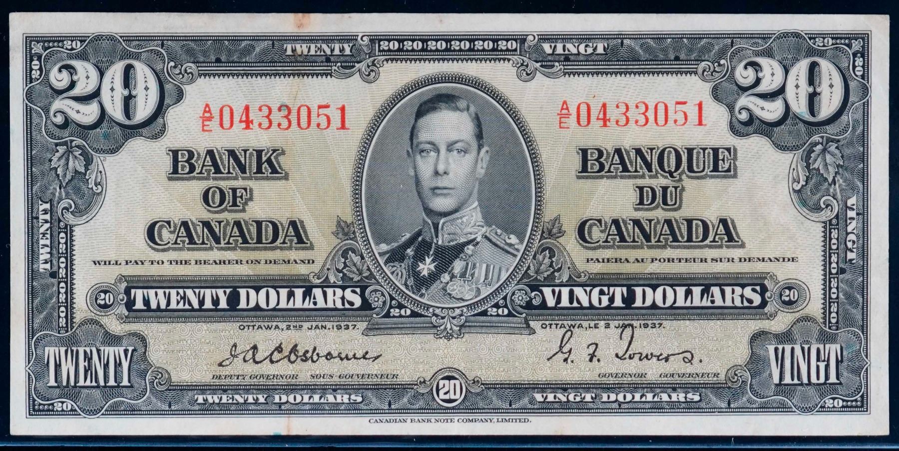 1937 $20 BC-25a #A/E0433051 "Osbourne-Towers" AU, bright example with minor stain.