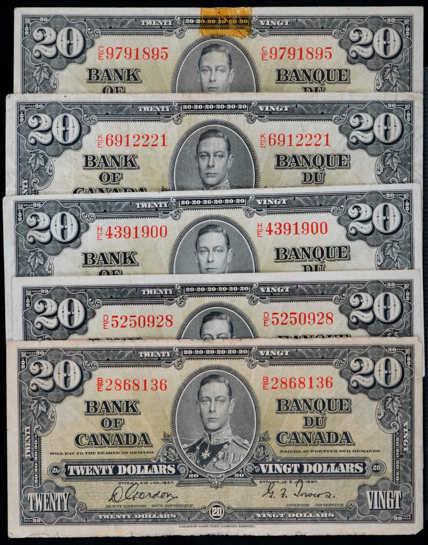 1937 $20 BC-25b & 25c F to VF, Lot of 5 notes. One with tape.