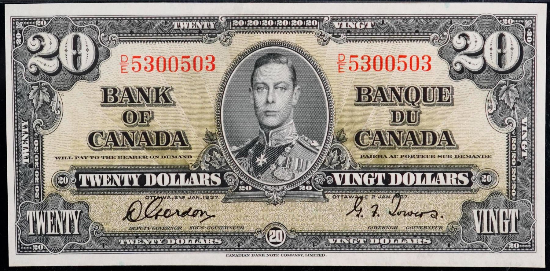 1937 $20 BC-25b #D/E5300503 PMG Gem Uncirculated-65 EPQ. A bright and attractive example.