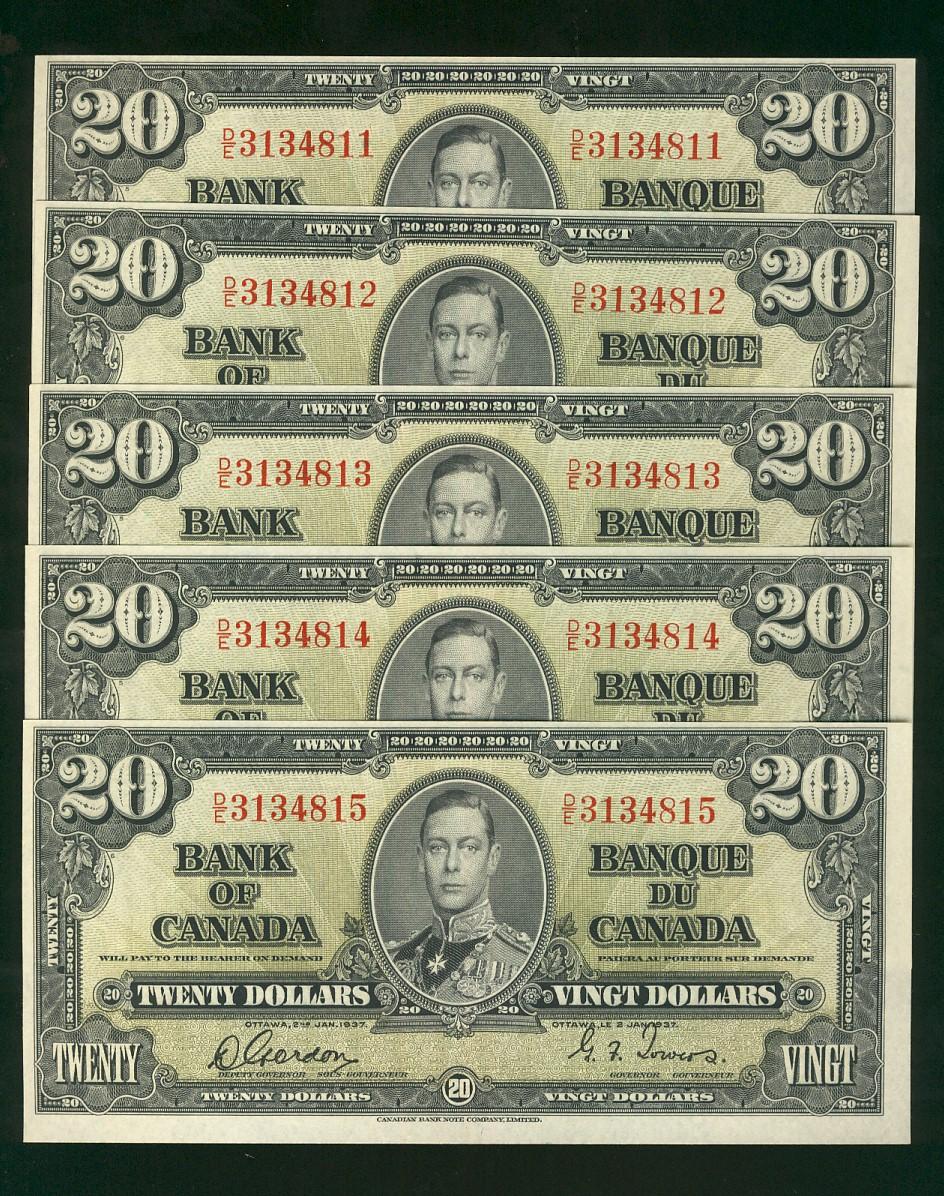 1937 $20 BC-25b #DE3132811-815. Lot of 5 consecutive AU to UNC notes.