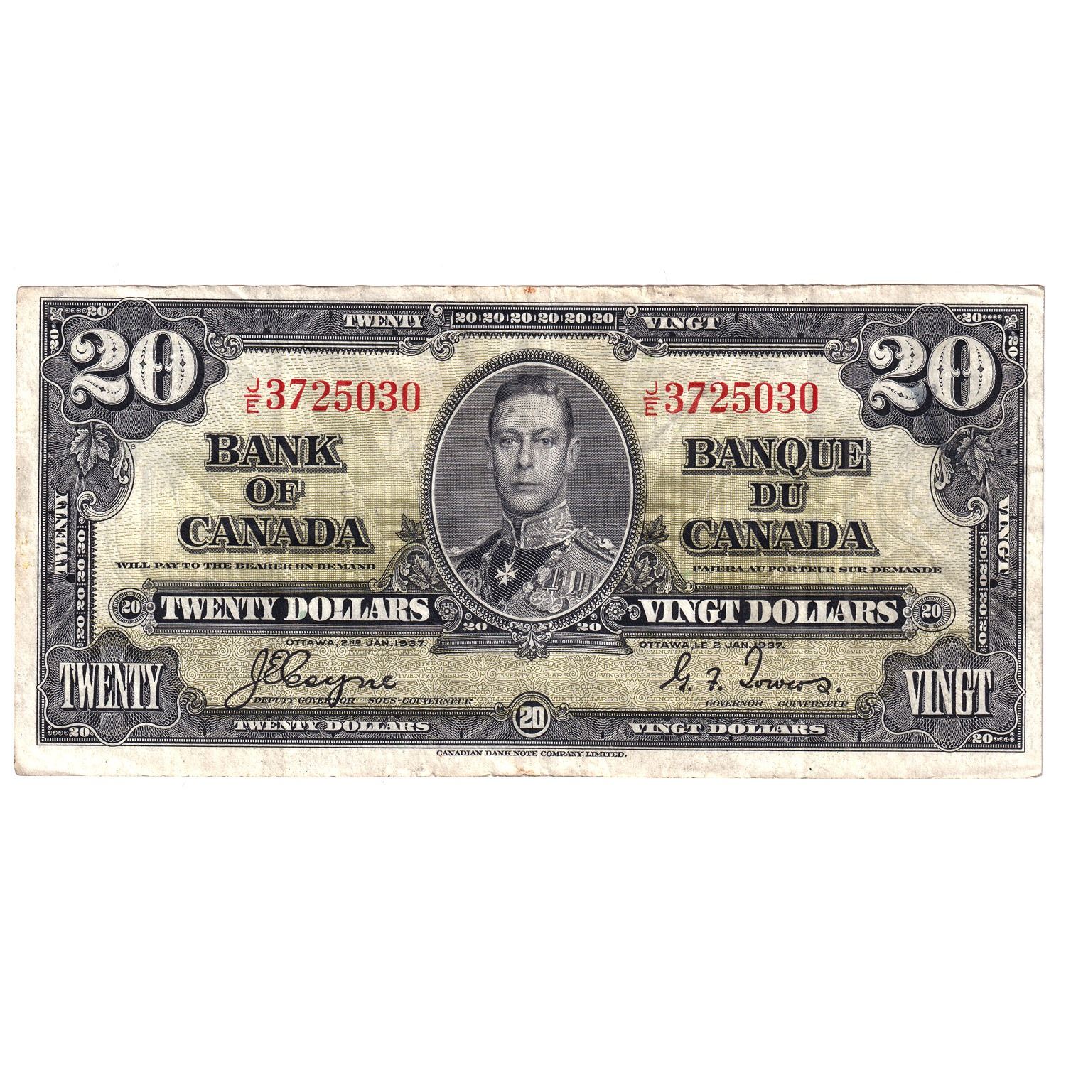 1937 $20 BC-25c, Bank of Canada, Coyne-Towers, J/E3725030, VF. Note contains a hole and a pinhole on