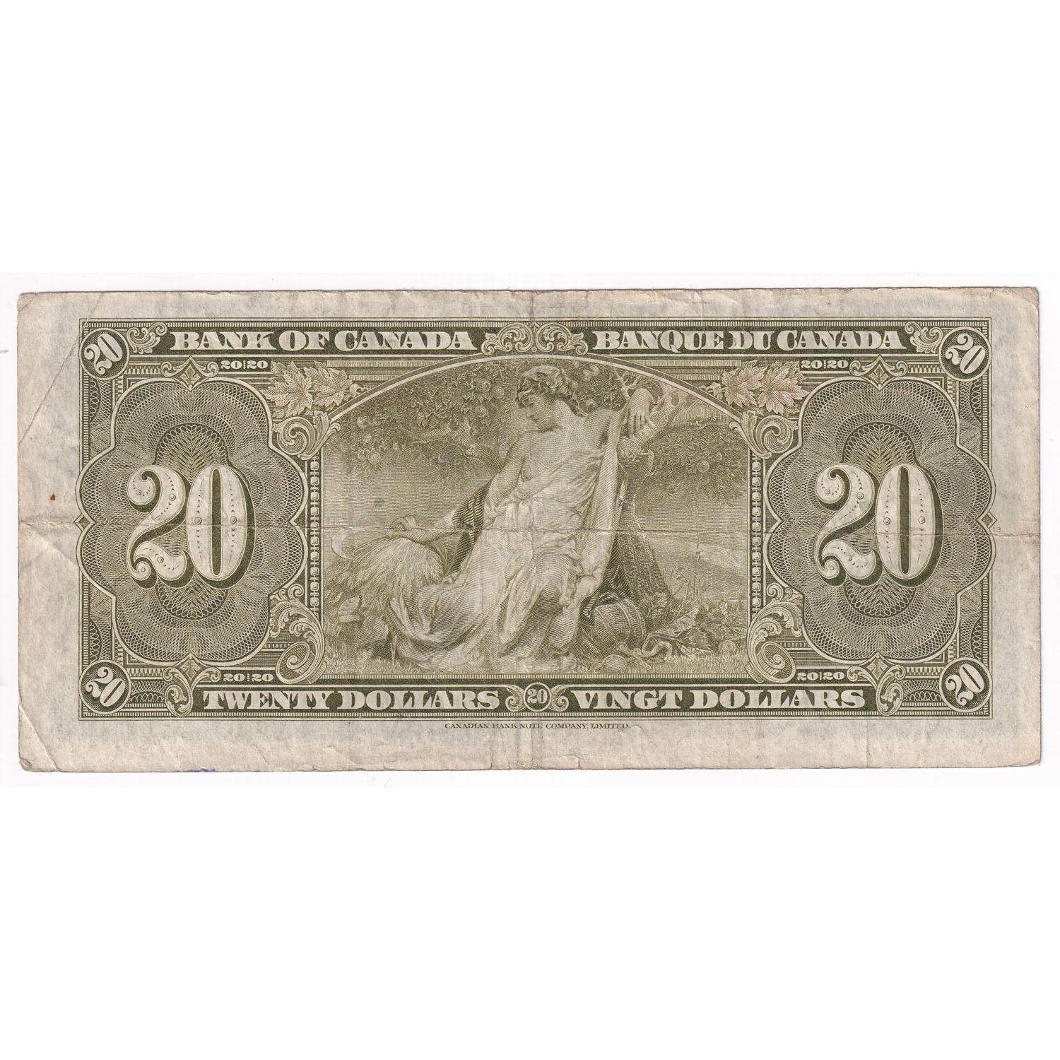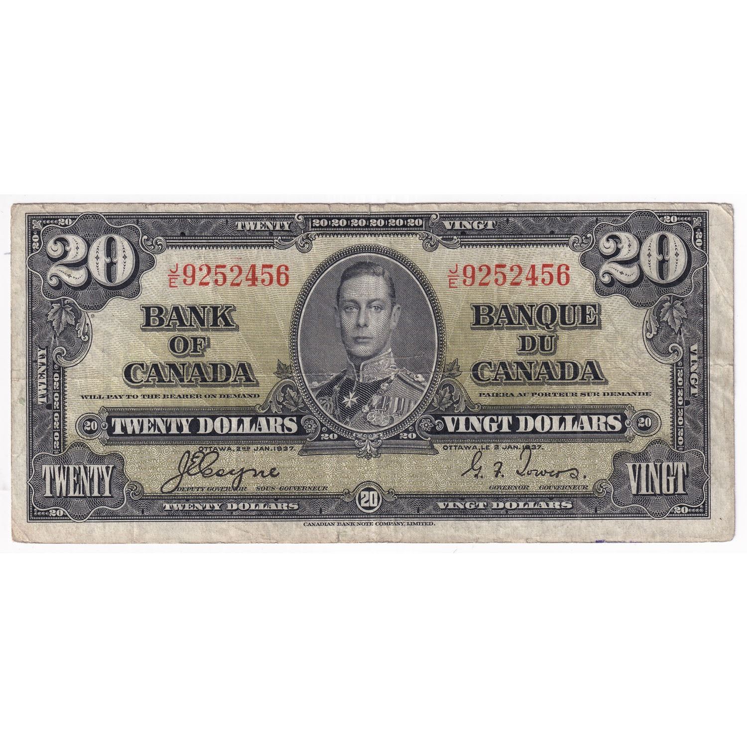 1937 $20 BC-25c Bank of Canada, Coyne-Towers, J/E9252456, Fine. Note has some minor tears mostly in the upper margin.
