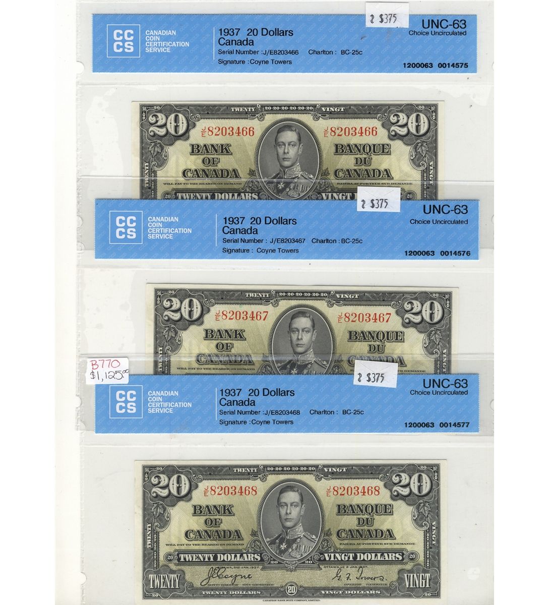 1937 $20 BC-25c CCCS UNC-63, J/E Coy/Tow, 3 Consecutive