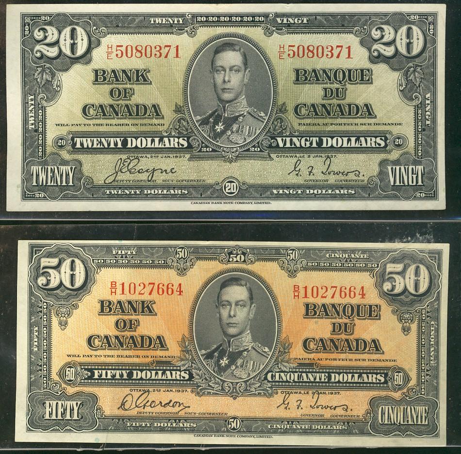 1937 $20 BC-25c #HE5080371 & 1937 $50 BC-26b #BH1027664. Lot of 2 notes EF to EF+ for grade.