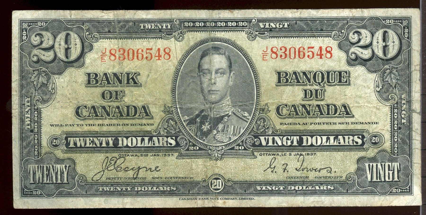 1937 20$ BC-25c #J/E8306548, VG/F for grade.