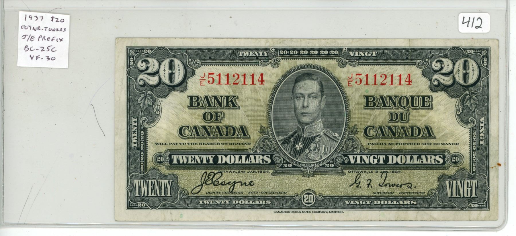 1937 $20. Coyne-Towers signatures. J/E Prefix. BC-25c. VF-30.