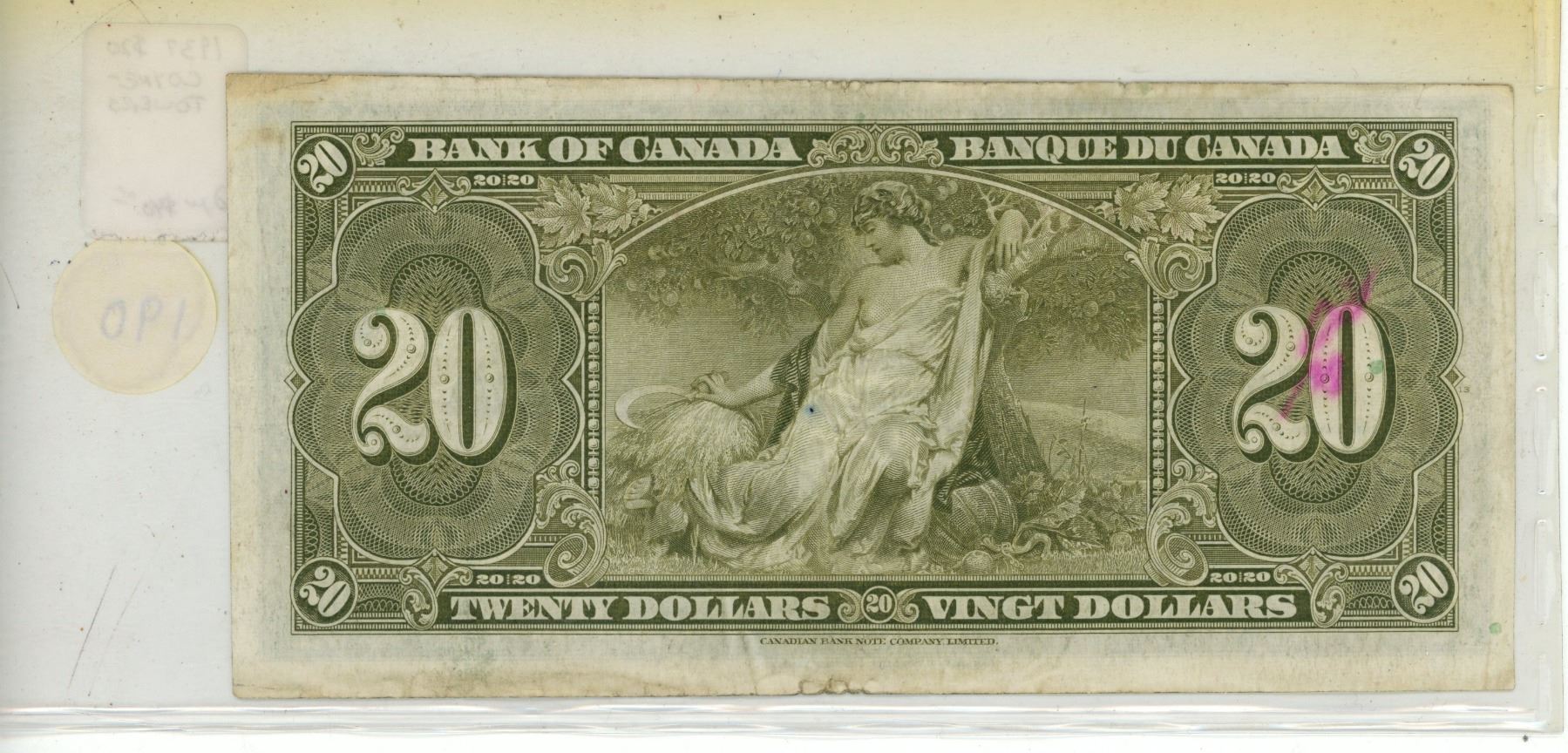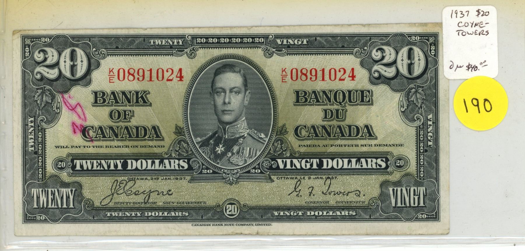 1937 $20. Coyne-Towers signatures. K/E Prefix. BC-25c. VF with writing.