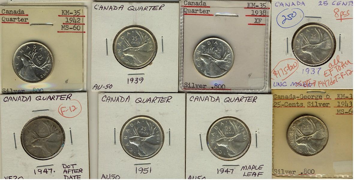 1937 25¢, 1938, 1939, 1942, 1943, 1947ML, 1951, 1947 Dot, all EF40 to AU50. Except the 47 dot is F1