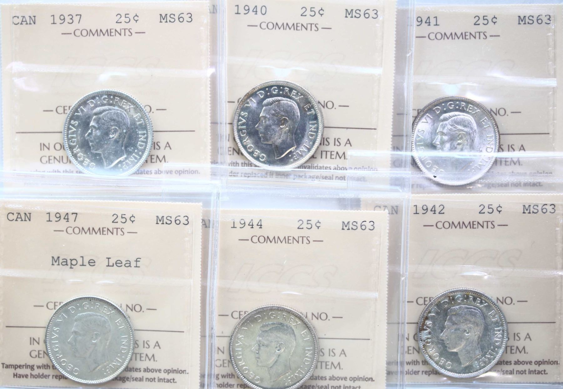 1937 25¢, 1940, 1941, 1942, 1944, 1947 "ML", All 6 coins ICCS Choice Mint State-63