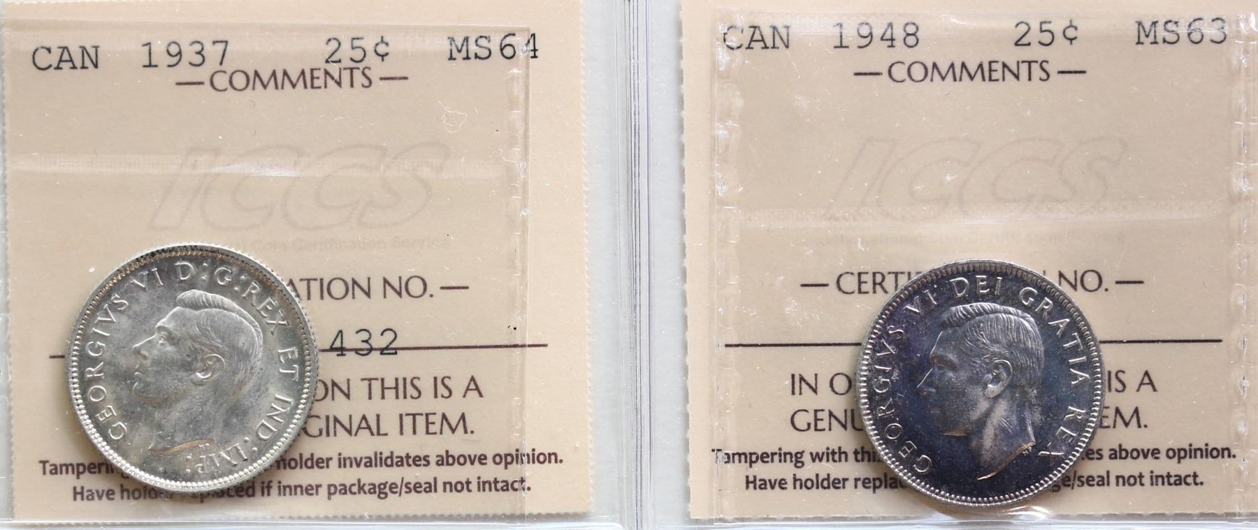 1937 25¢, 1948 Both coins ICCS Choice Mint State-63 & Choice Mint State-64