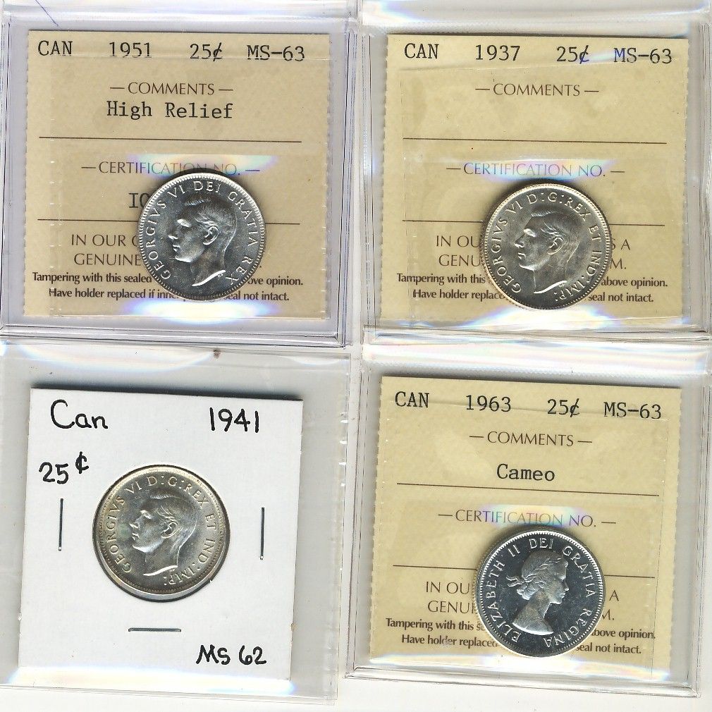1937 25¢, 1951 HR & 1963 Cam ICCS MS63 along with 1941 brilliant UNC. Lot of 4 coins.