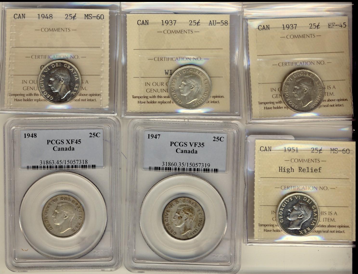 1937 25¢ EF45 ,1937 AU58, 1948 MS60 ,1951 HR MS60, All ICCS graded, and 1947 25¢ PCGS VF35 and 1948 PCGS EF45 Lot of 6 coins
