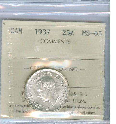 1937 25¢ ICCS MS65. Brilliant frostlike finish.