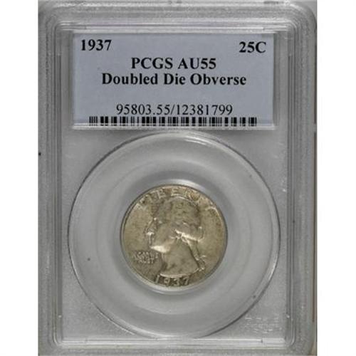 <B>1937 25C Doubled Die Obverse AU55 PCGS.</B></I> FS-101, formerly FS-012. All four digits in the date are noticeably doubled, along with IN GOD WE TRUST. Traces of luster reside in the recesses of this golden-gray quarter. Well struck and quite clean.<BR><BR><B>Coin Engraver:</B> John Flanagan<BR><BR><b>Shipping:</b> Coins & Currency (<a target="_blank" href="http://www.heritageauctions.com/common/shipping.php">view shipping information</a>)