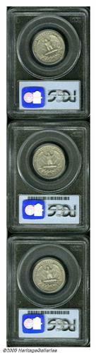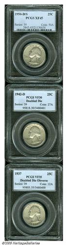 <B>1937<25C> Doubled Die Obverse VF35 PCGS,</B></I> doubling is seen mostly on the motto; <B>1942-D Doubled Die Obverse VF30 PCGS,</B></I> doubling is noted on LIBERTY and the motto; and a <B>1950-D/S XF45 PCGS, </B></I> the S is quite clear under the D. A trio of interesting, circulated Washington Quarter die varieties.<BR><I>From The Western Hills Collection.</B></I>