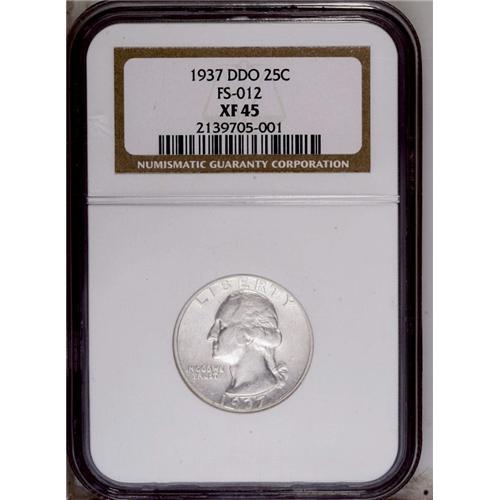 <B>1937<25C> Doubled Die Obverse XF45 NGC.</B></I> FS-012. IN GOD WE TRUST and the date are strongly die doubled. Silvery surfaces display luster in the areas around the design elements. Some pinscratches on the Washington motif are mentioned for accuracy.