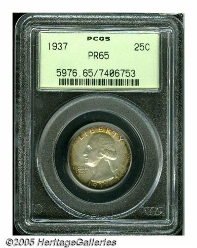 <B>1937<25C> PR65 PCGS.</B></I> A splendid toned Gem Proof example with ivory surfaces accented by gold and iridescent peripheral toning.