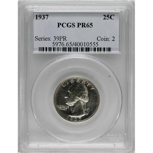 <B>1937 25C PR65 PCGS.</B></I> PCGS Population (447/399). NGC Census: (238/278). Mintage: 5,542. Numismedia Wsl. Price for NGC/PCGS coin in PR65: $460. (#5976)<BR><BR><b>Shipping:</b> Coins & Currency (<a target="_blank" href="http://www.heritageauctions.com/common/shipping.php">view shipping information</a>)