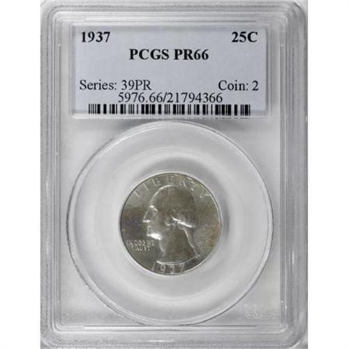 <B>1937 25C PR66 PCGS.</B></I> A natural beauty with hints of pale heather toning and a few splashes of speckled gold iridescence. This Premium Gem proof is a delightful quarter.<BR><BR><B>Coin Engraver:</B> John Flanagan<BR><BR><b>Shipping:</b> Coins & Currency (<a target="_blank" href="http://www.heritageauctions.com/common/shipping.php">view shipping information</a>)