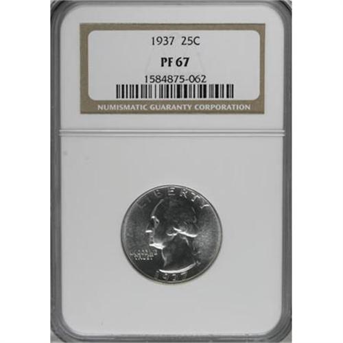 <B>1937 25C PR67 NGC.</B></I> This gleaming Superb Gem is practically brilliant with just a touch of haze at the right obverse and reverse. An attractive representative of this early proof Washington quarter issue. NGC has graded 13 finer pieces (10/07).<BR><BR><B>Coin Engraver:</B> John Flanagan<BR><BR><b>Shipping:</b> Coins & Currency (<a target="_blank" href="http://www.heritageauctions.com/common/shipping.php">view shipping information</a>)