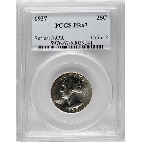 <B>1937 25C PR67 PCGS.</B></I> An exceptional Superb proof example of this scarce, second year of issue for modern proofs. Only 5,542 pieces were struck and few are known today this well preserved. The centers are brilliant and the peripheries display spotty russet and blue patina.<BR><BR><b>Shipping:</b> Coins & Currency (<a target="_blank" href="http://www.heritageauctions.com/common/shipping.php">view shipping information</a>)