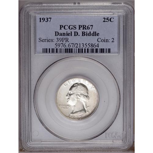 <B>1937<25C> PR67 PCGS.</B></I> Ex: Daniel D. Biddle Collection. Gently toned in speckled, milky silver-gray shades that are more sparsely distributed on the reverse. Well struck aside from the obverse margin at 4 o'clock. Population: 76 in 67, 2 finer (1/06).