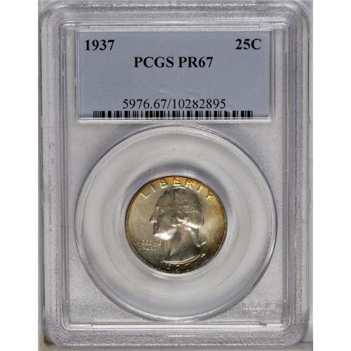 <B>1937<25C> PR67 PCGS.</B></I> Rich golden-brown and ice-blue peripheries frame pearl-gray interiors. Strengthened plumage detail (as made) confirms the proof dies, but the vigorous satin luster (and the bold die crack through the second T in STATES) suggests a later impression. A beautiful and virtually unimprovable Superb Gem. Population: 80 in 67, 2 finer (6/06).
