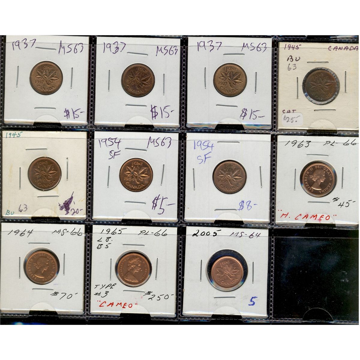 1937(3) 1¢, 1945(2), 1954SF(2), 1963, 1964, 1965 LB B5 & 2005. Lot of 11 coins.
