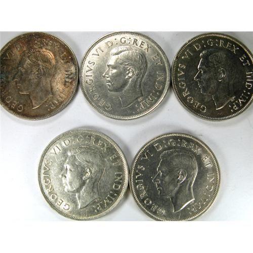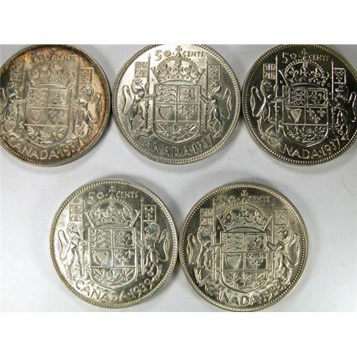 Canada Fifty Cents 1937 three pieces, Uncirculated, AU and AU Cleaned. 1937 three pieces, Uncirculated, AU and AU Cleaned. Plus 1938 and 1939 both EF-AU. Total five pale toned to lightly toned pieces