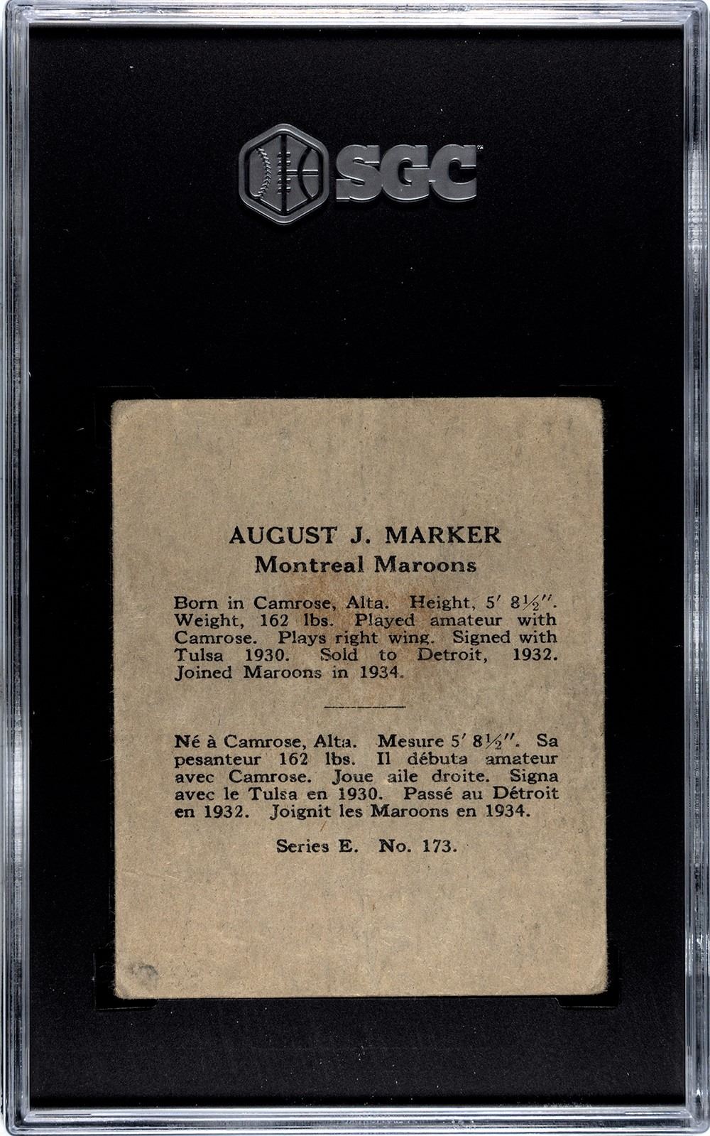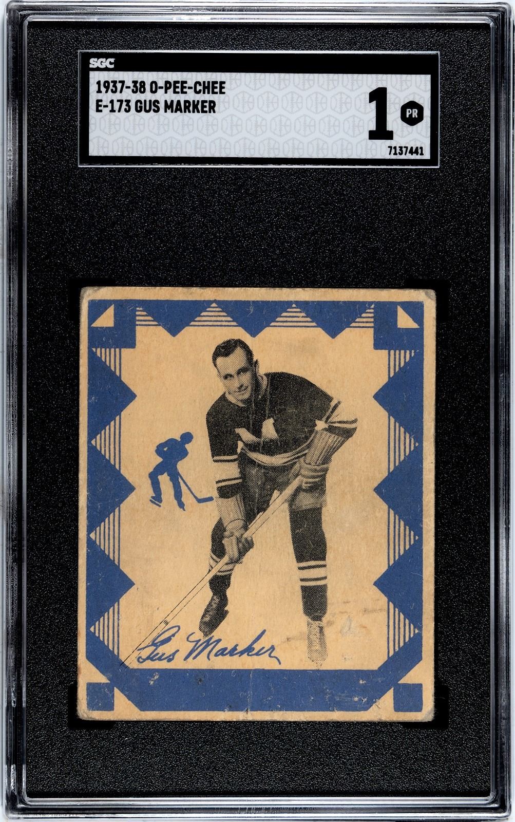Another off-grade 37-38 OPC card, this one featuring August "Gus" Marker, who played from 1927 to 1943, wearing the jerseys of Detroit, Montreal, Toronto and Brooklyn (i.e. NY Americans). This one grades 1 PR by SGC.