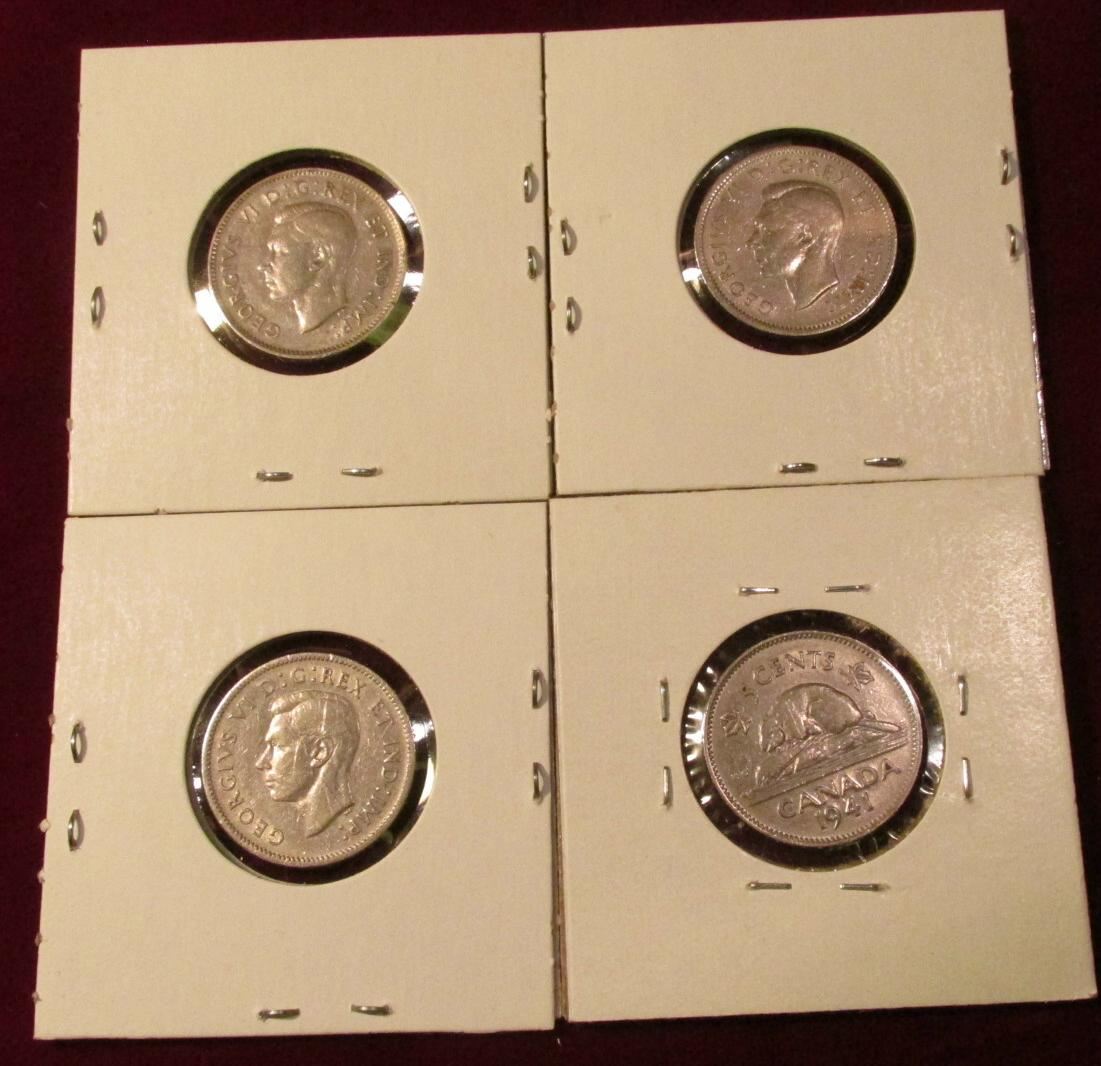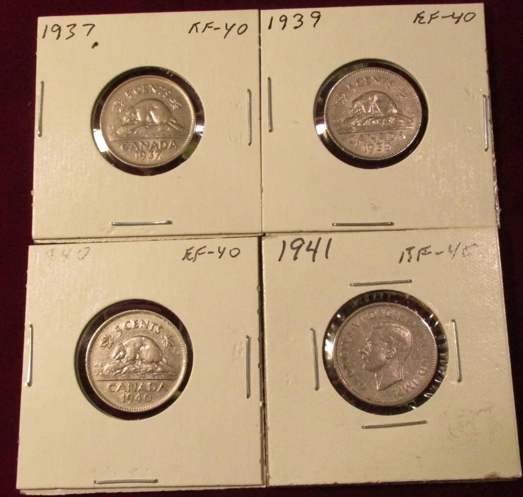 1937, 39, 40, & 41 Canada Nickels. All EF. Catalog value $24.00.