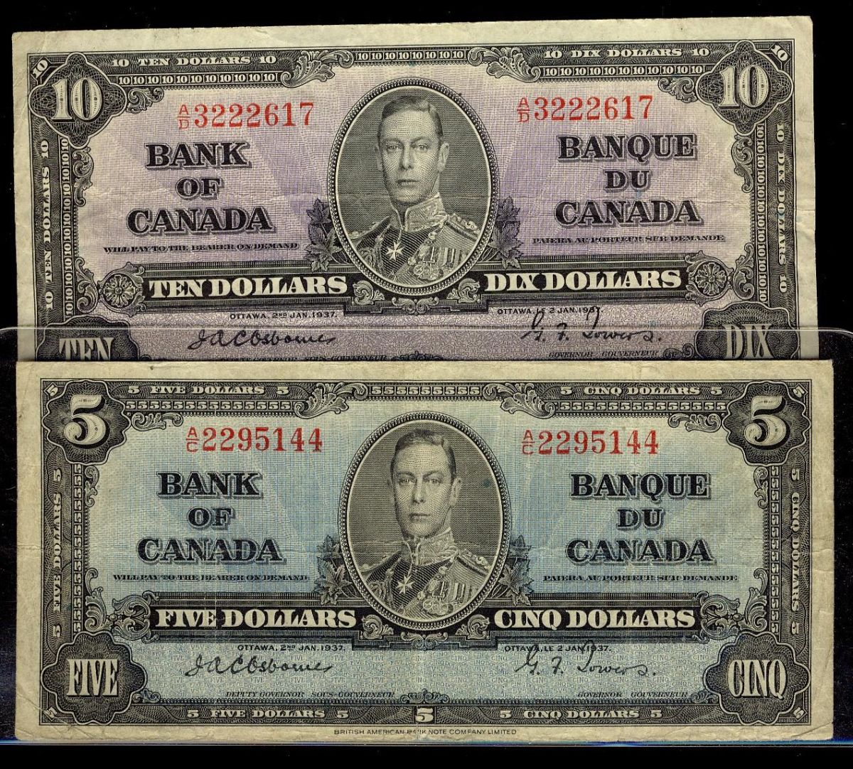 1937 $5 & $10 Osborne, BC-23a and BC-24a. Lot of 2 Osborne issues F to VF.