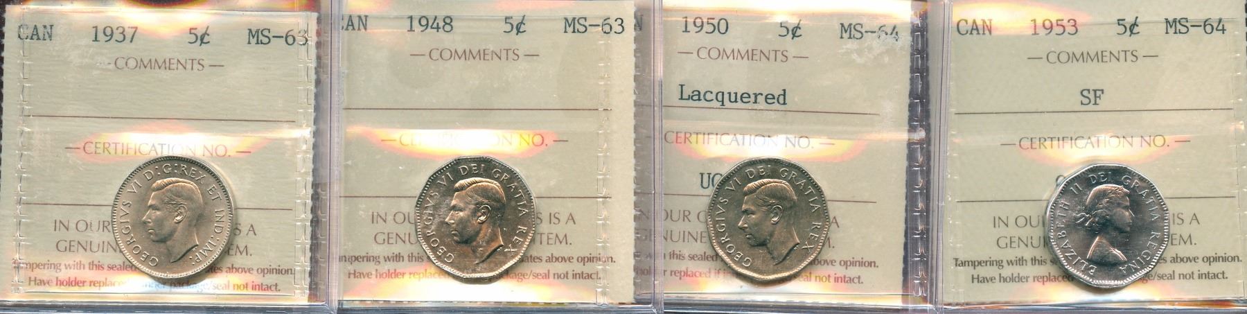 1937 5¢, 1948 Choice Mint State-63 & 1950, 1953 SF Choice Mint State-64. Lot of 4 ICCS graded coins with 1950 designated as lacquered.