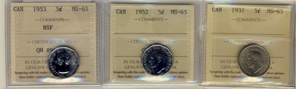 1937 5¢, 1952 & 1953 NSF ICCS MS65. Lot of 3 coins.
