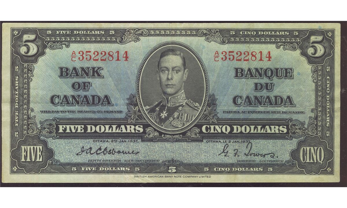1937 $5 BC-23a #AC3522814, CCCS VF30.