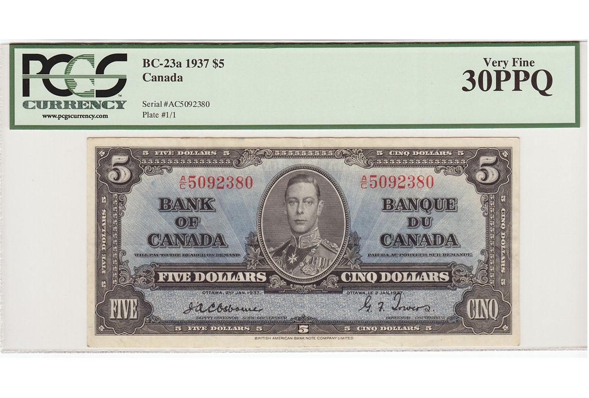 1937 $5 BC-23a #AC5092380 PCGS VF30PPQ.
