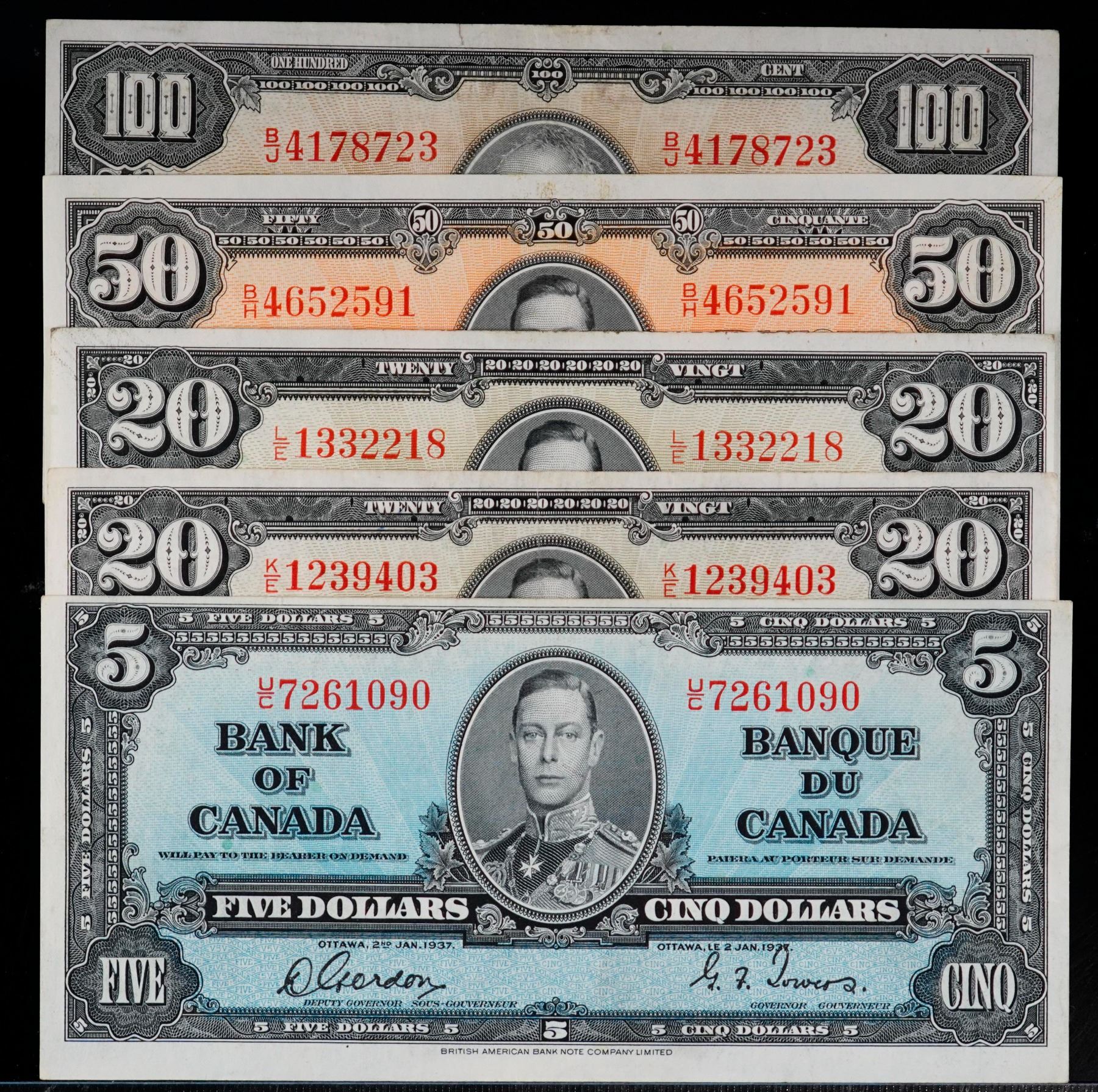 1937 $5 BC-23b, $20 BC-25c(2), $50 BC-26c & $100 BC-27c. Lot of 5 notes all VF+ or better. $100 w/