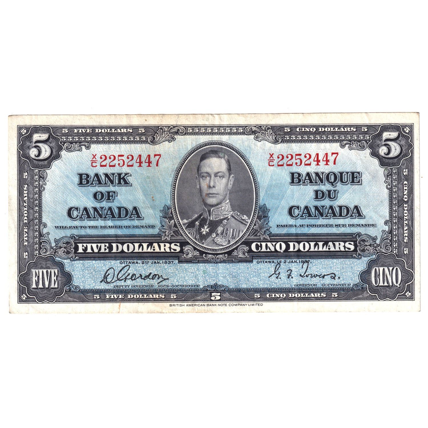 1937 $5 BC-23b Bank of Canada Note with Gordon-Towers Signatures, X/C2252447, VF (Stain almost fully on back of note).