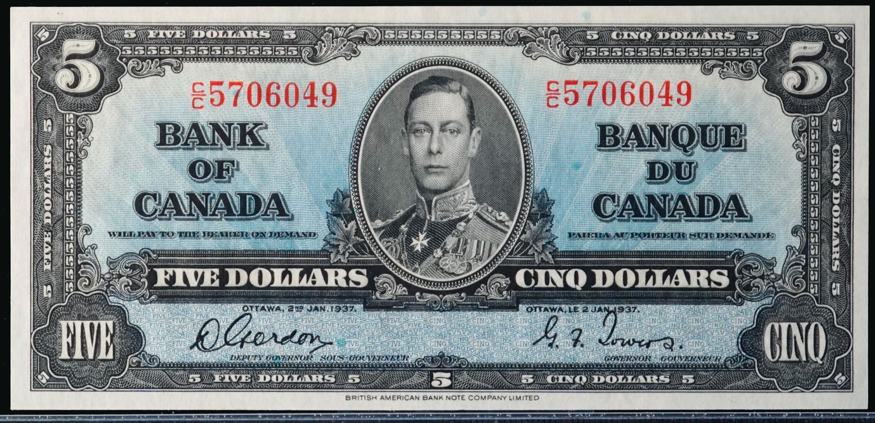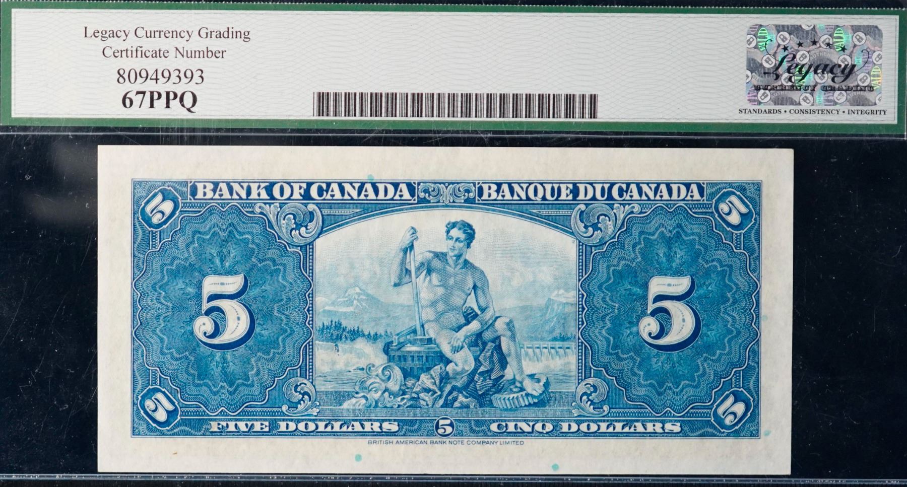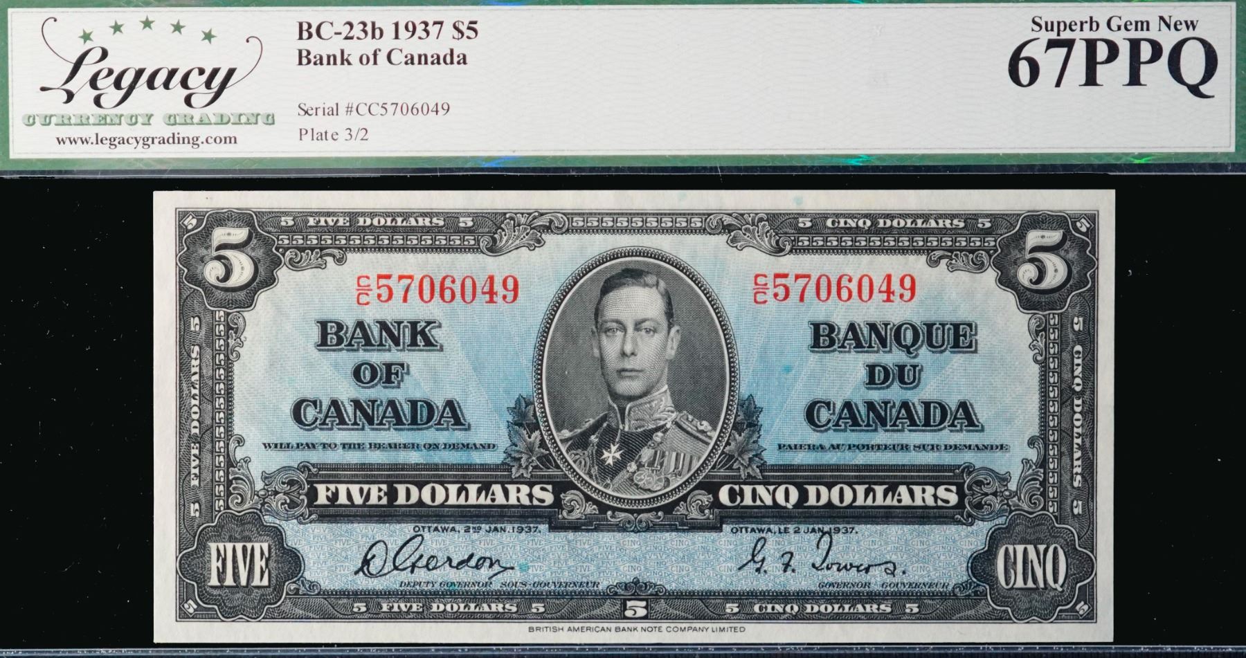 1937 $5 BC-23b #C/C5706049 Legacy Currency Grading Superb Gem Uncirculated-67PPQ. This is a pristine issue with great eye appeal, good margins and superb embossing.