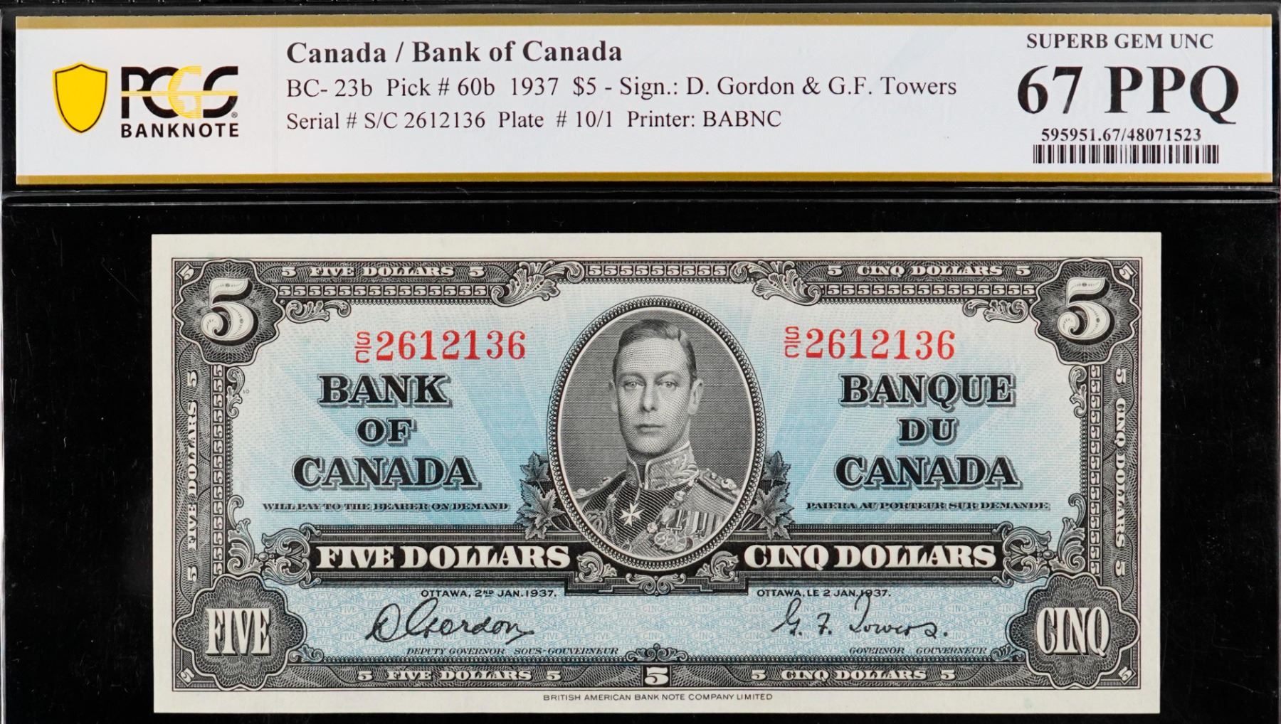 1937 $5 BC-23b #S/C2612136 PCGS Superb Gem Uncirculated-67PPQ. An exceptional high grade example with great centering and exceptional paper quality. Among the finest examples. Worth a premium bid. Excessively scarce and desirable.