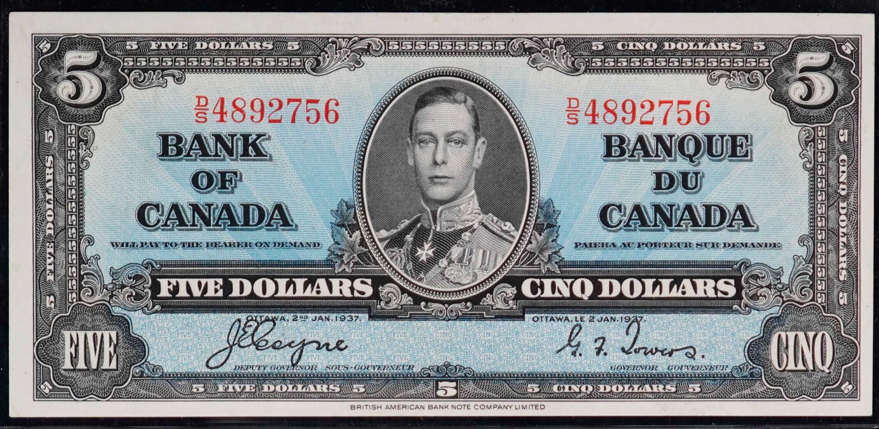 1937 $5 BC-23c #D/S4892756 AU, Pressed.