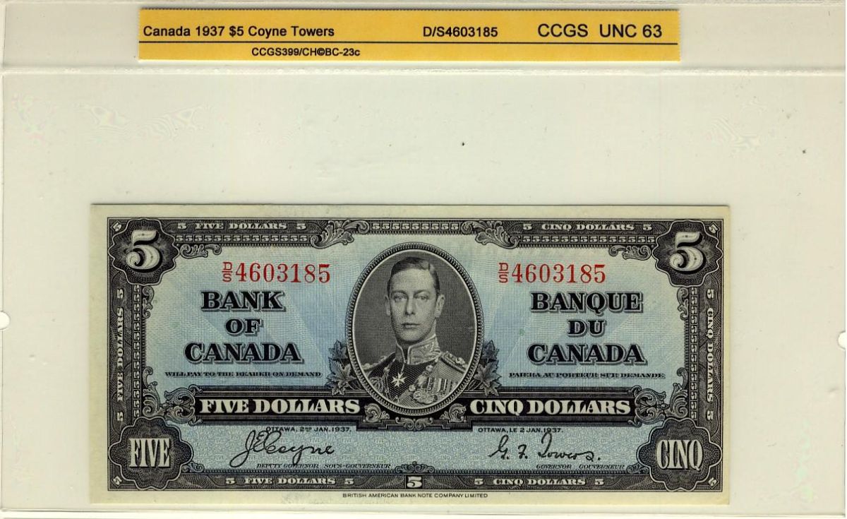 1937 $5 BC-23c #DS4603185. CCGS UNC63.