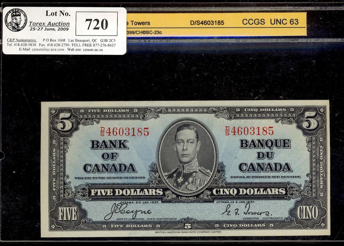 1937 $5 BC-23c #DS4603185. CCGS UNC63.