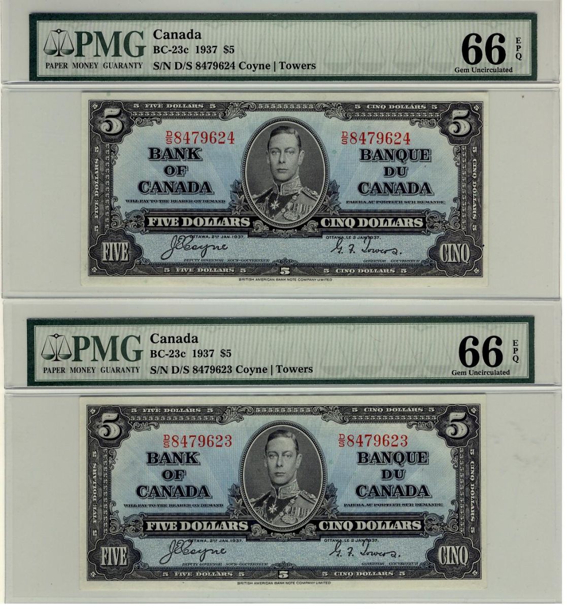 1937 $5 BC-23c #DS8479624 & 623 PMG Gem UNC66 EPQ. Lot of 2 superb notes.