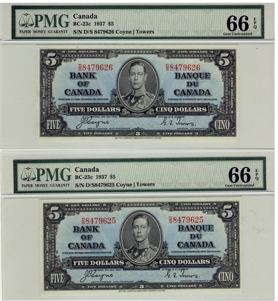 1937 $5 BC-23c #DS8479625 & 626 PMG Gem UNC66 EPQ. Lot of 2 superb notes.