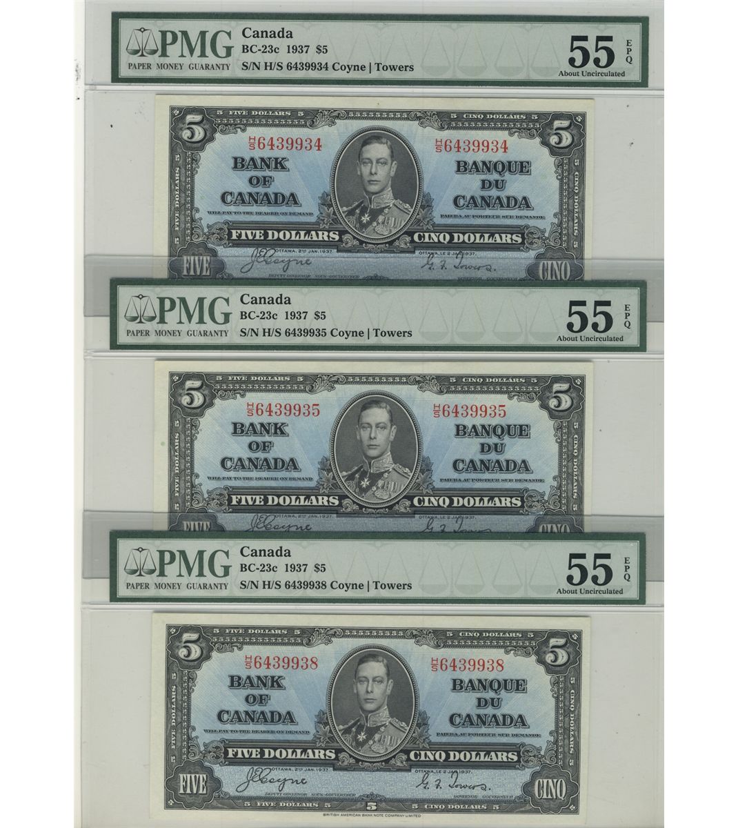 1937 $5 BC-23c #HS6439934/935 & 938 all PMG AU55. Lot of 3 notes. Actual run falls consecutive with next lot of 2 notes in AU58 grades.