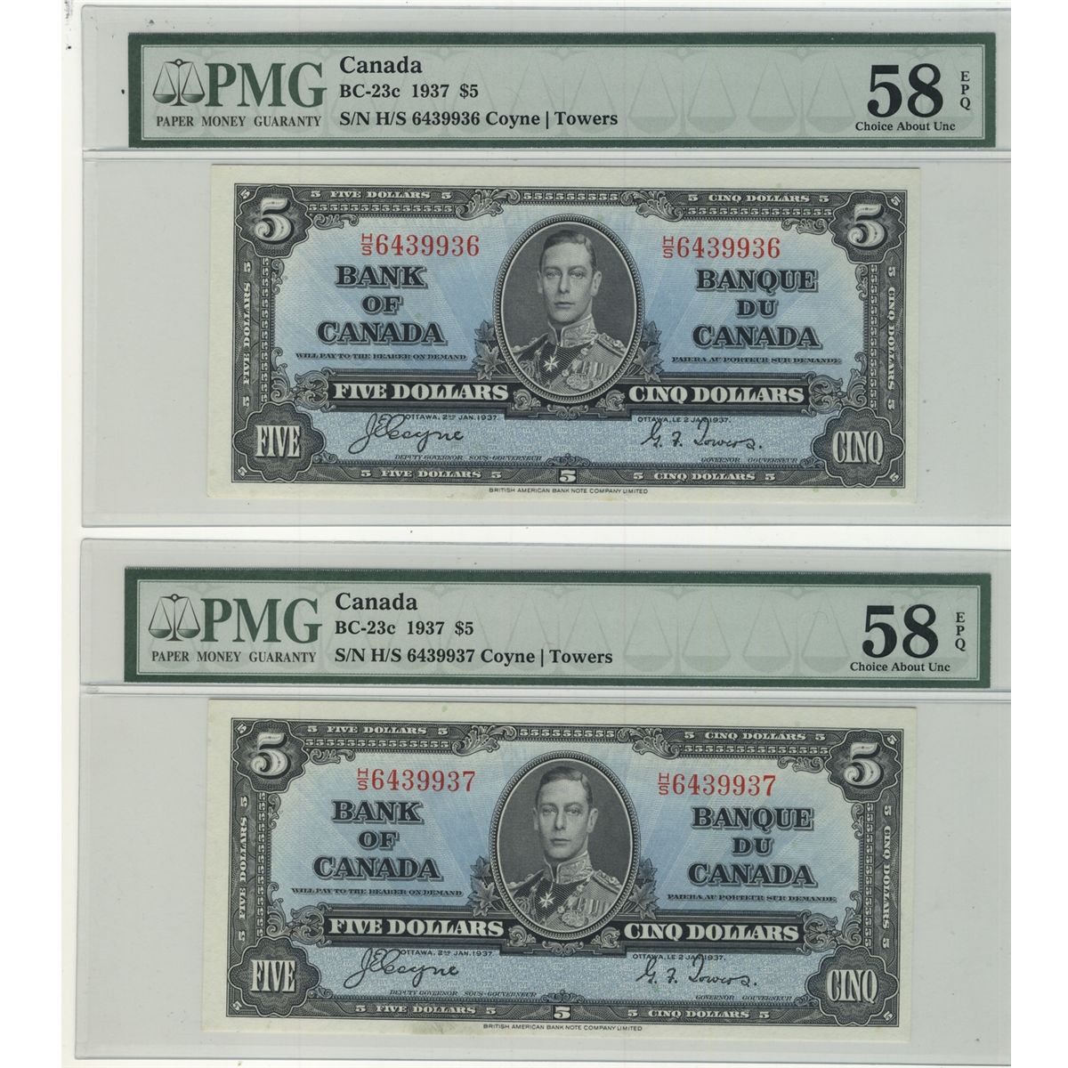 1937 $5 BC-23c #HS6439936 & 937 PMG AU58. Lot of 2 notes. With previous lot, makes series of 5 consecutive notes.